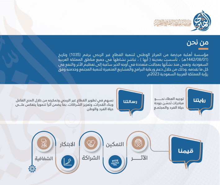 مؤسسة مانحة مرخصة من المركز الوطني لتنمية القطاع غير الربحي برقم (1035) وتاريخ (1442/08/01 هـ)، تأسست بمدينة أبها، تباشر نشاطها في جميع مناطق المملكة العربية السعودية، وتعمل المؤسسة منذ نشأتها في أوجه الخير ساعية إلى تعظيم الأثر والنفع في كل ما تقدمه لتنمية القطاع غير الربحي، وذلك من خلال دعم ورعاية مجموعة من البرامج والمشاريع المميزة لتنمية المجتمع وخدمته وفق رؤية المملكة العربية السعودية 2030م.